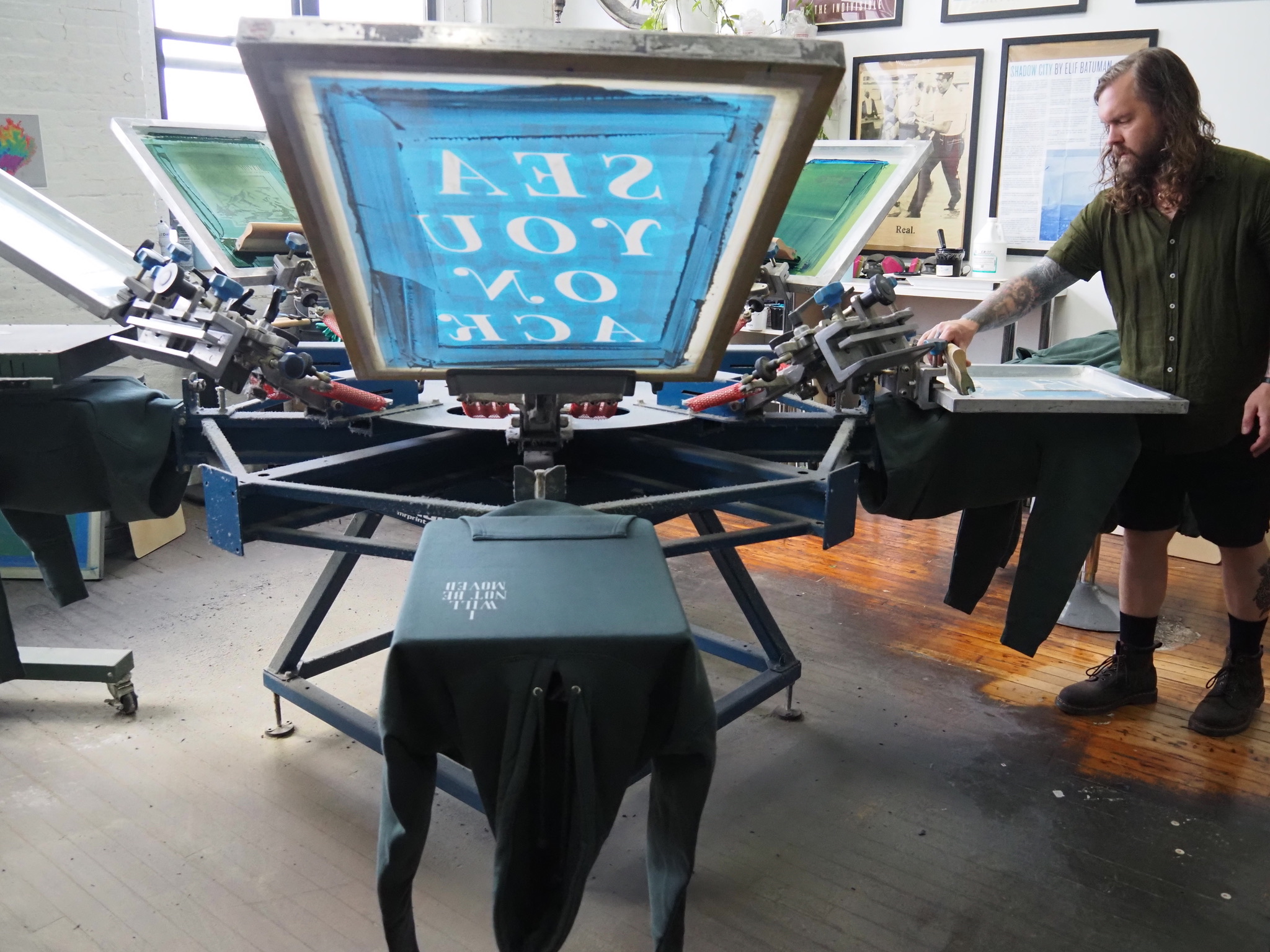 Wunder Print and Design is run by Jordan and Megan Wunder, who started the shop together after moving to Brooklyn in 2010. Jordan got into making things early — he was into punk, building bullet belts and printing shirts out of his bedroom in high school. That turned into a t-shirt line, which eventually led to screen printing for other people instead of just himself. Megan came from a background in graphic design and worked as a buyer at a clothing store, so she’s always had an eye for detail and a strong sense of what makes something work visually.